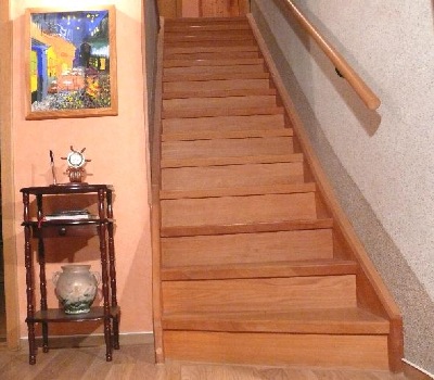 Das Projekt für die neue Treppe wurde nach Besichtigung der der alten Treppe in Zusammenarbeit mit dem Kunden entwickelt. Die Restaurierung der alten Treppe oder deren Aufarbeitung wurde vom Kunden verworfen. Gesichtspunkte der Denkmalpflege spielten bei der Holzgestaltung der Treppen keine Rolle. Für die neue Treppe waren die folgenden Anforderungen zu erfüllen: Verringerung des Steigungswinkels der Treppe durch Hinzufügen von zwei weiteren Stufen, Einhaltung der Treppenlaufbreite, Veränderung der Treppenöffnung zur Gewährleistung der geforderten lichten Treppendurchgangshöhe, Ausführung als Wangentreppe in Massivholz Buche, Antrittstufe zur Raummitte gewinkelt, als Holzschutz Oberfläche geölt, Handlauf Rundholz. Die neue Treppe wurde in der Holzwerkstatt angefertigt und dann vor Ort montiert. Zum Projekt gehörten auch die Demontage der alten Treppe und danach die Montage der neuen Treppe und die Transportleistungen.